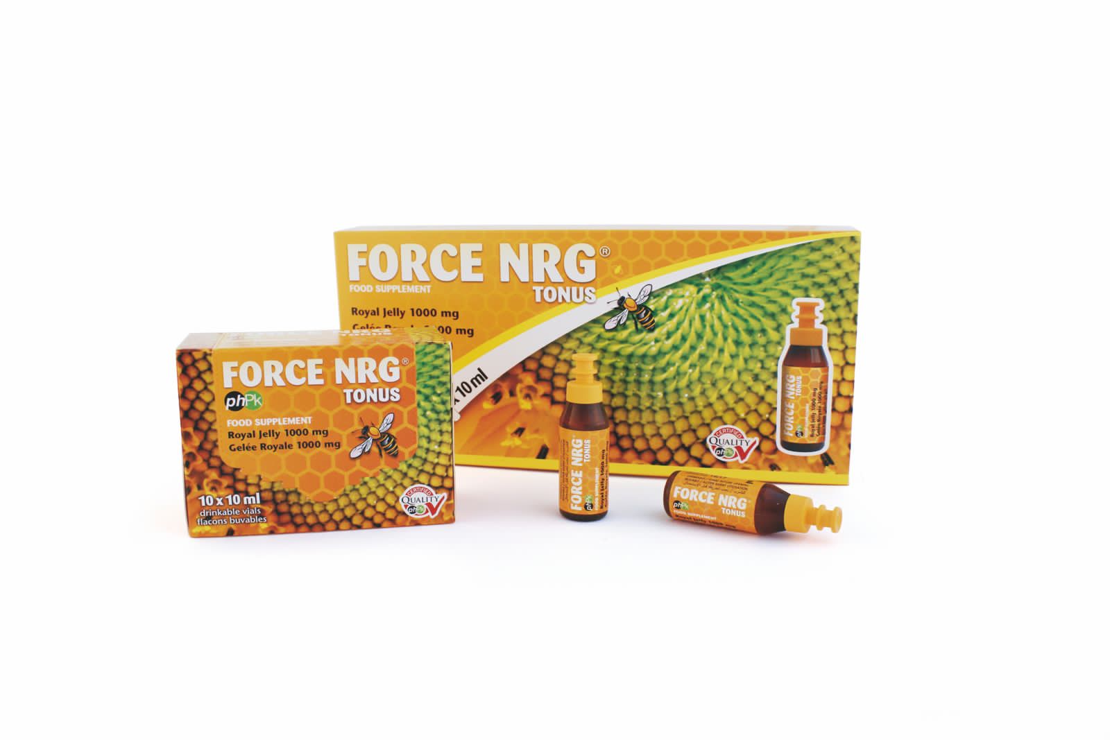 غذاء ملكات النحل المجفد ١٠٠٠ ملجم، فيتامين سي (L Ascorbic Acid)، ماء، سكر الفاكهة (فركتوز)، نكهة البرتقال، مواد حافظة (بوتاسيوم سوربات وصوديوم بنزوات).
