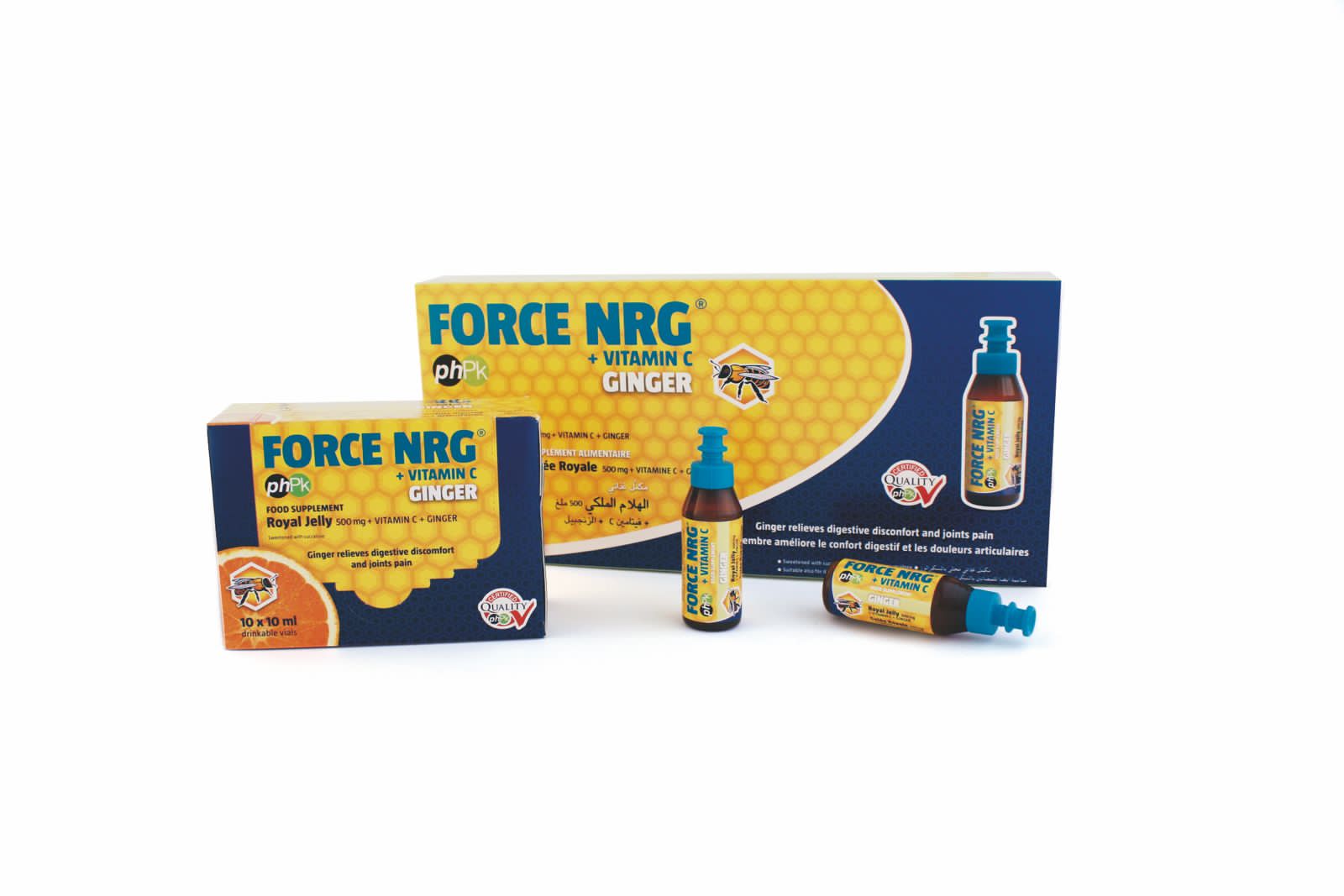 غذاء ملكات النحل المجفد ٥٠٠ ملجم، فيتامين سي (L-ascorbic acid)، مستخلص الزنجبيل ١٠٠٠ ملجم، ماء، سكرلوز مادة محلية، نكهة التفاح، مواد حافظة (بوتاسيوم سوربات وصوديوم بنزوات).